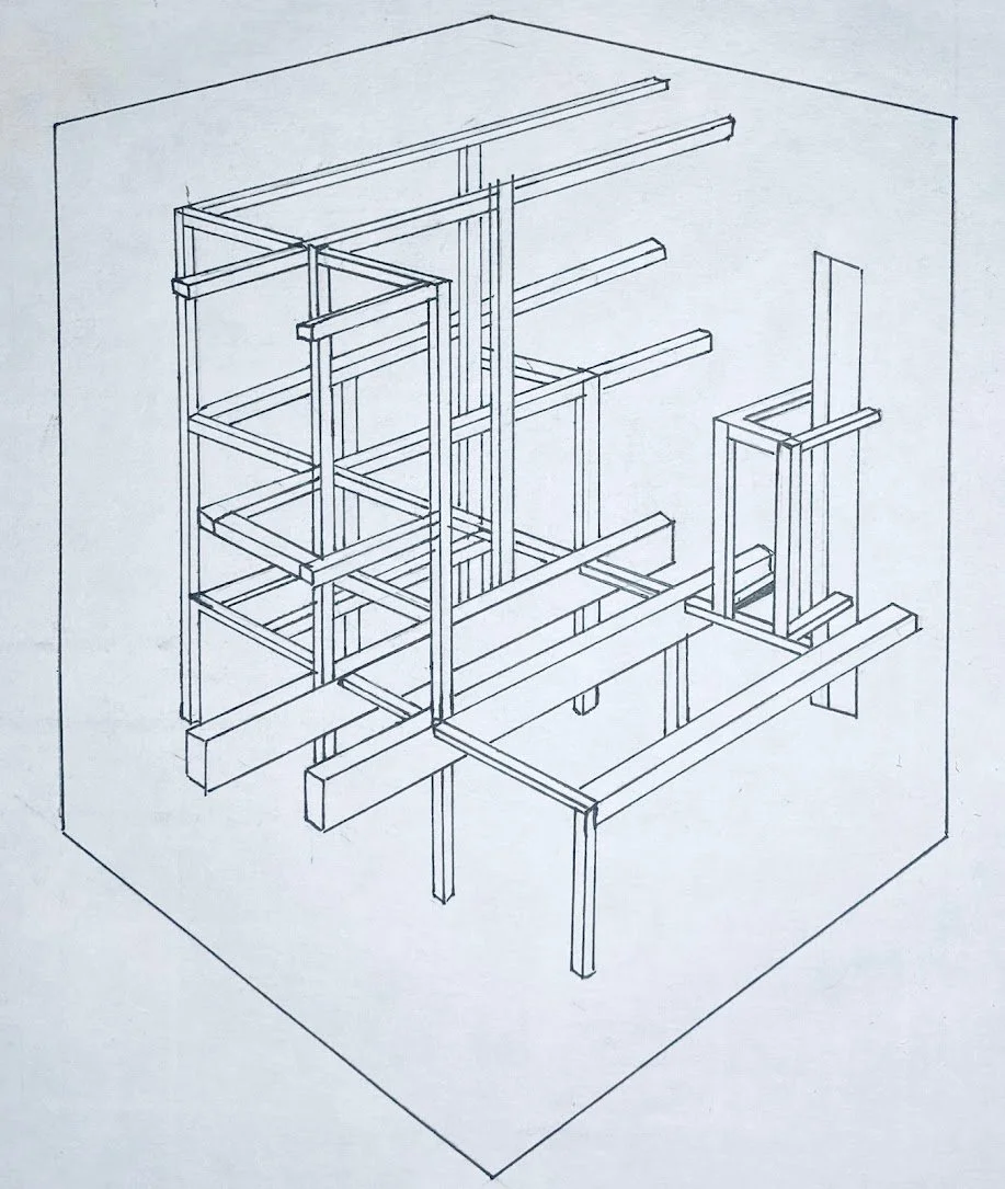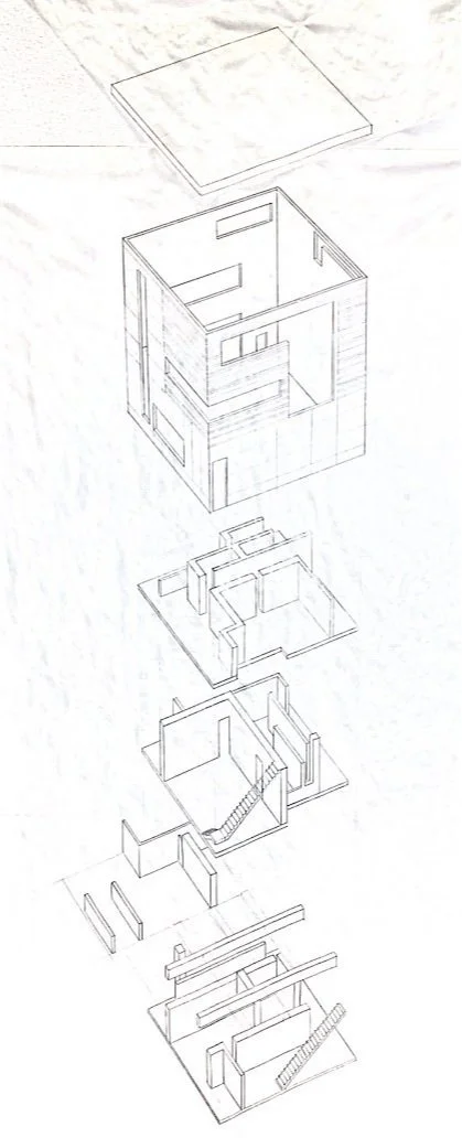 This small-scale architectural concept mediates between public and private spaces through layered depth and perspective. Hand-drawn plans and models illustrate the integration of structure and function. A key feature is a retractable shelving system designed for flexibility, blending aesthetic form with everyday usability.